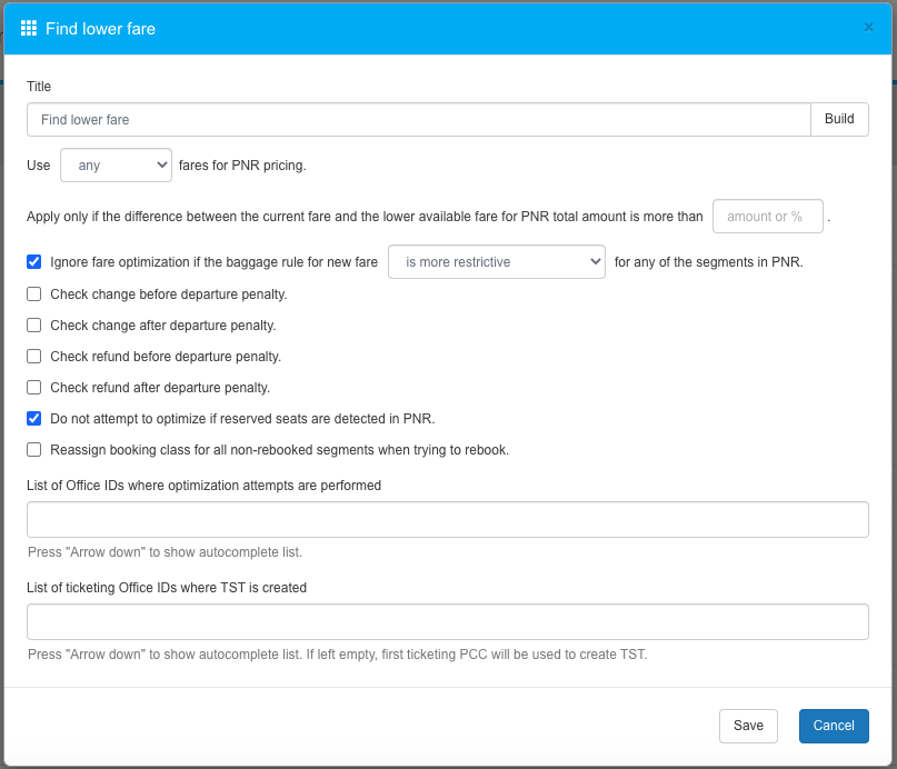 - Do not attempt to optimize if reserved seats are detected in PNR. If checked: do not attempt to find a lower fare if reserved seats exists in the booking.