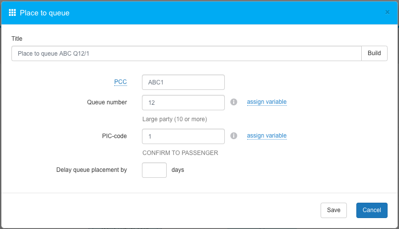 Specify destination OfficeID/PCC, Queue number and Category (optional)/PIC code.