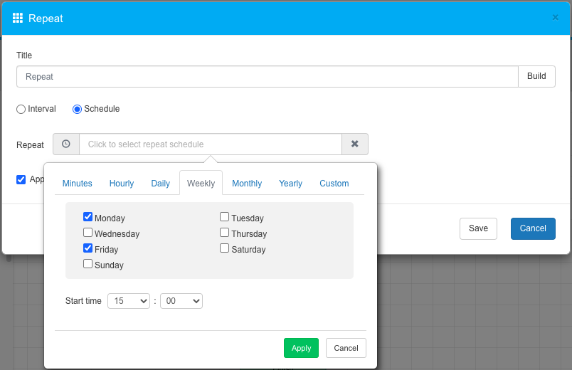 Repeat means repeat the process from Start after a specified amount of hours or interval.