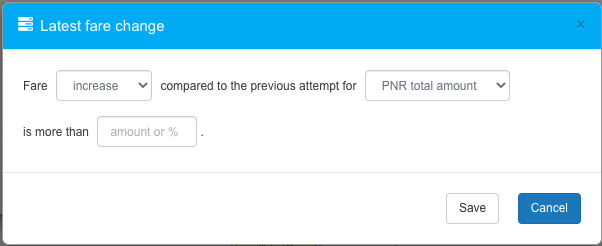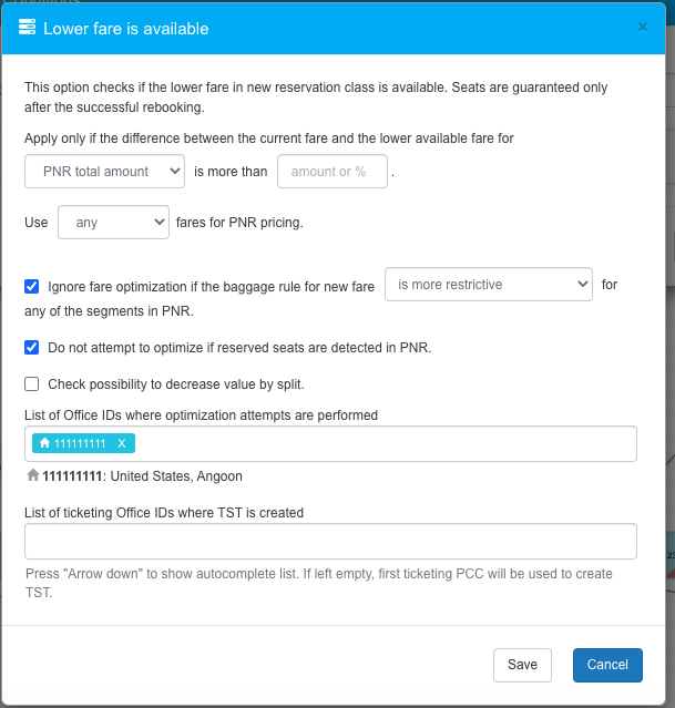 Apply only if the difference between the current fare and the lower available fare for PNR total amount or Adult total amount is more than xx amount or xx %.