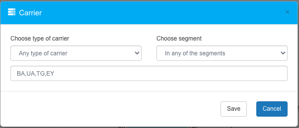 Any type of carrier, Marketing carrier, Operating carrier or Issuing carrier and In any of the segments, In the first segment, In the last segment, In one of the middle segments or in All segments.