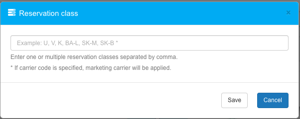 Enter one or multiple reservation classes separated by comma. If a carrier code is specified, the marketing carrier will be applied.