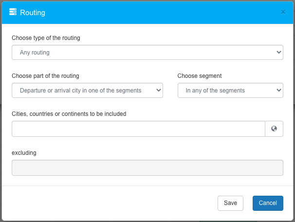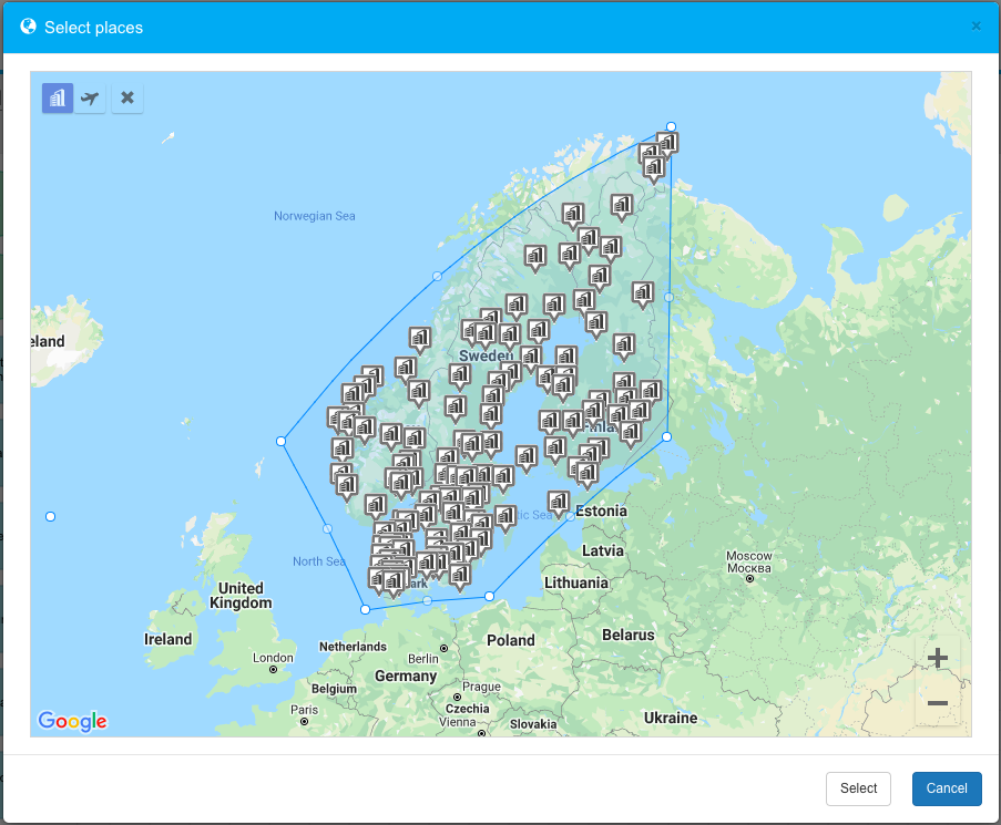 Enter cities, airports or countries for the condition to use, click the map icon to quickly mark a region.