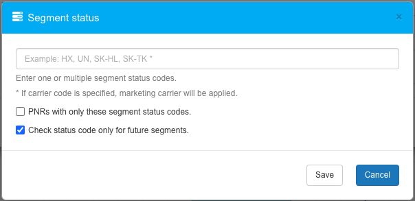 Enter one, multiple or a range of flight numbers. If a carrier code is specified, the marketing carrier will be applied.