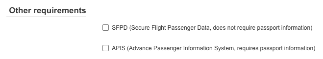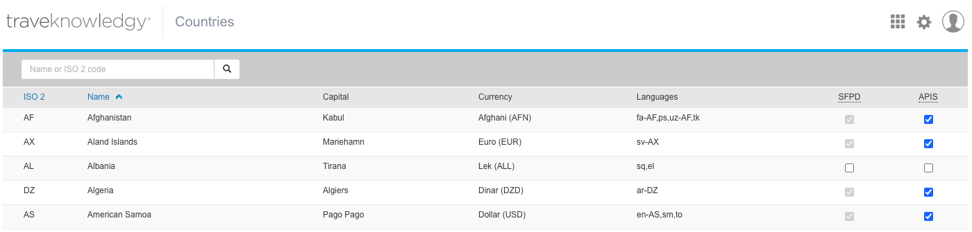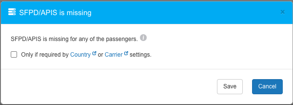 Which countries and/or carriers that are set up to require SFPD and/or APIS can be found in the settings.